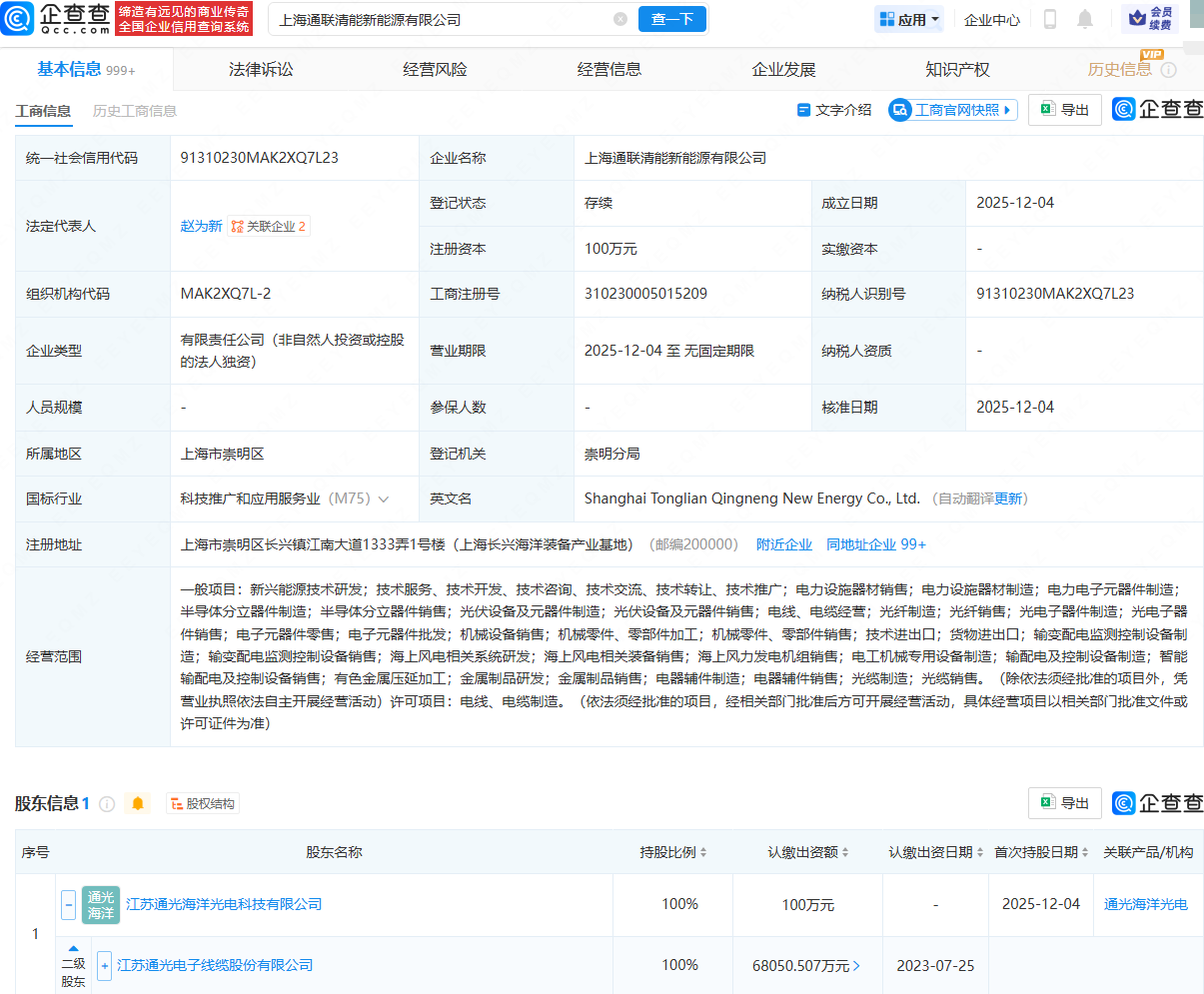 近日杨方配资线上站,上海通联清能新能源有限公司成立,法定代表人为赵为新,经营范围包含:电力设施器材销售;电力电子元器件制造;半导体分立器件制造;半导体分立器件销售;电线、电缆经营;光纤制造等。企查查股权穿透显示,该公司由通光线缆(300265)间接全资持股。